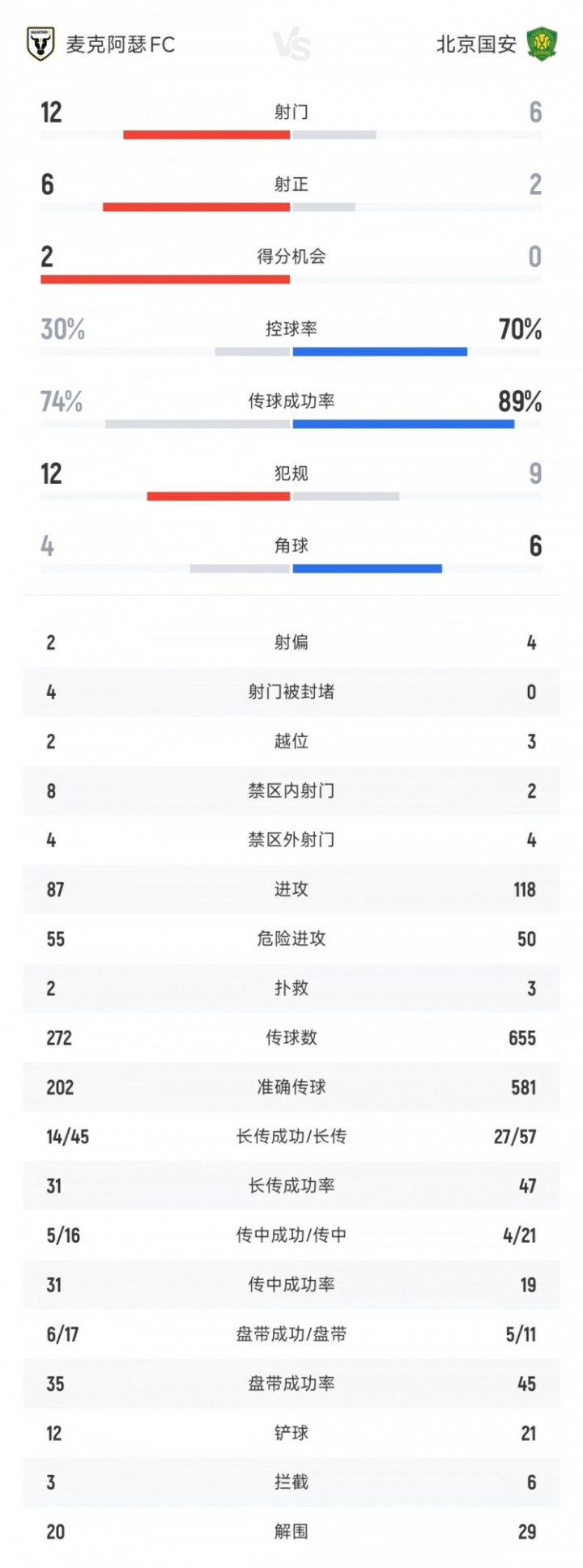 直播吧10月03日讯亚冠二级联赛小组赛E组第2轮,北京国安客场0-3不敌麦克阿瑟,掉至小组垫底,麦克阿瑟升至小组第二。