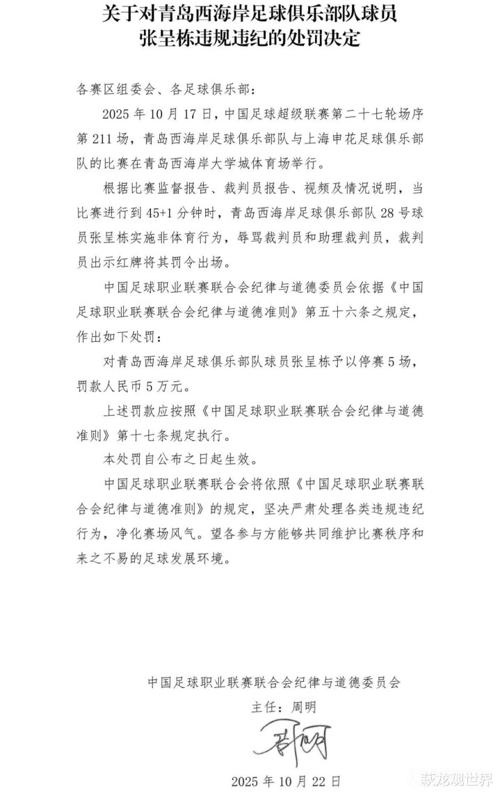 10月22日下午,中足联官方发布一则处罚公告,青岛西海岸球员张呈栋因辱骂裁判被禁赛5场并罚款5万元。在中超仅剩三轮的情况下,此番被禁赛,意味着张呈栋已经提前结束了本赛季联赛,值得一提的是,张呈栋与青岛西海岸俱乐部的合同今年年底到期。俱乐部不可能再和他续约了。