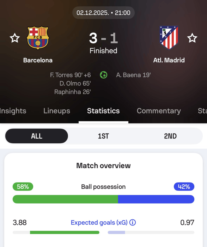 本场比赛巴萨占尽优势,他们的预期进球数量达到了3.88。