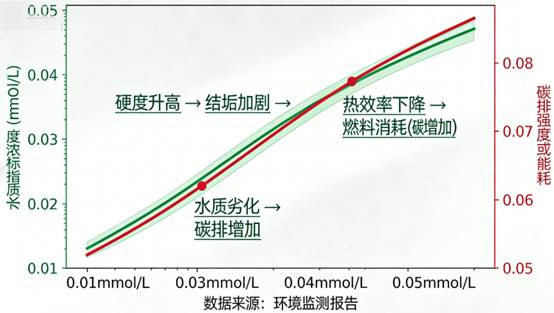 水质硬度过高会导致锅炉、换热器结垢,热效率下降 5%-15%,被迫消耗更多燃料(增加碳排);
