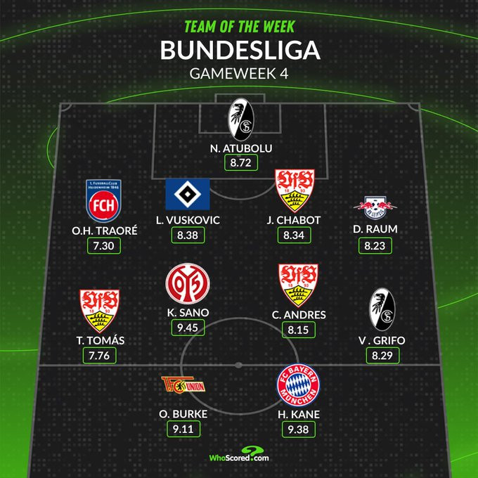 虎扑09月22日讯Whoscored今日发布德甲第4轮最佳阵容盘点,凯恩领衔,武什科维奇入选。