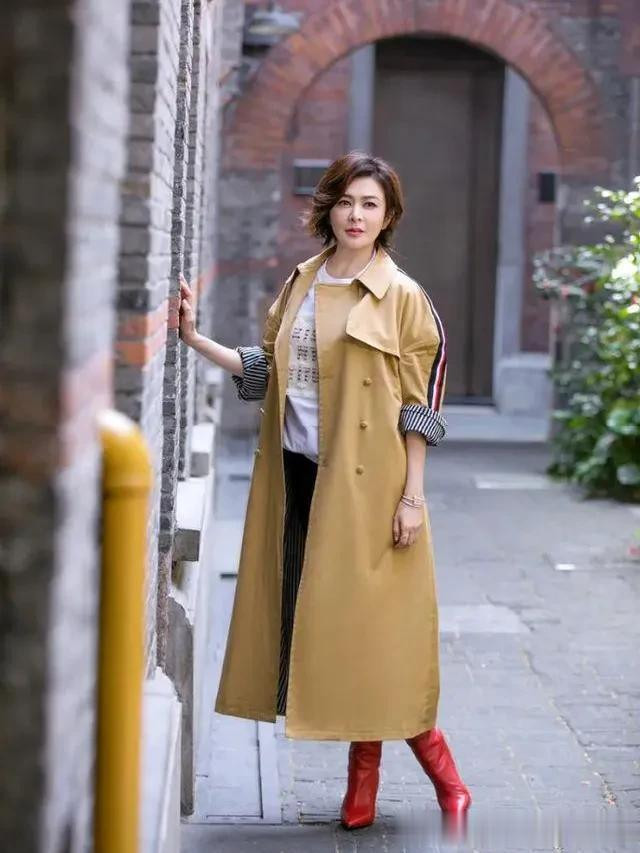 50岁梅婷真会赶时髦! 穿黑色大衣配破洞牛仔裤, 洋气又高级!