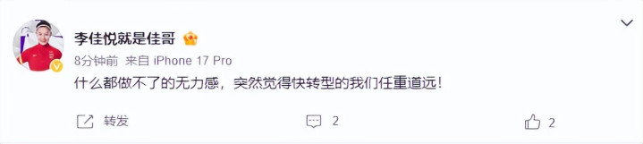 熬夜看球的李佳悦在社交媒体表示,“什么都做不了的无力感,突然觉得快转型的我们任重道远! ”